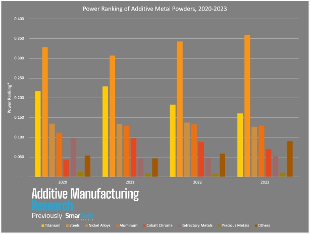 近期,增材制造研究(AMR)公布了一項關(guān)于金屬材料使用率的相關(guān)調(diào)查結(jié)果,從其繪制的最新圖表中可看出金屬增材制造粉末中各種金屬的“實力排名”。
