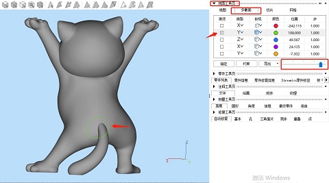 ②在左側視圖工具頁,選擇“多截面”,類型中即指不同方向軸的截面,當然我們也可以點擊展開后自行選擇別的截面,如3點確定一個別的角度的截面。勾選激活某個截面后,拉動下方的移動軸即可控制模型上的截面的移動。同時我們也可以在“剖視”欄選擇不同的視圖效果,把截面移動至自己需要切割的位置。