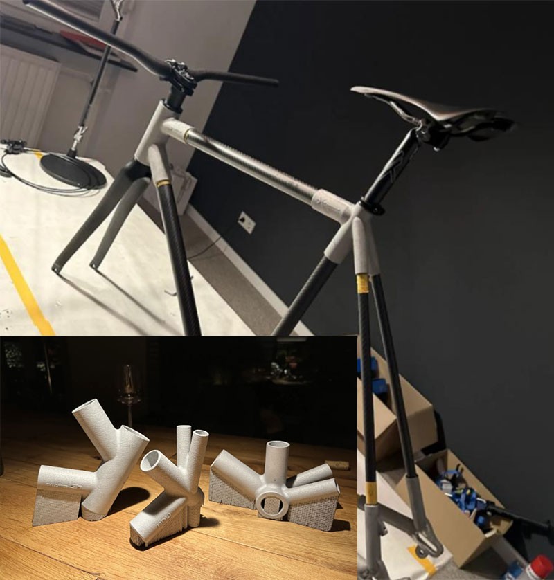 了解到,這輛自行車采用了碳纖維管+3D打印鋁制連接件的形式拼裝而成。他們在車頭、底架、車座和后下叉周圍使用了3D打印鋁制連接件,并將碳纖維管連接在一起。